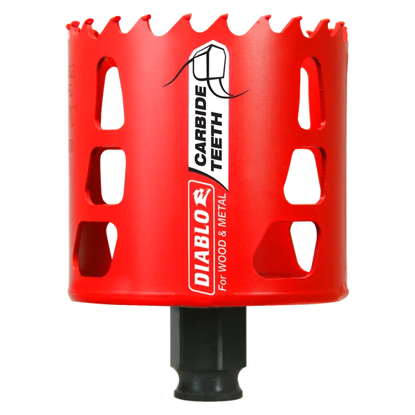 Diablo introduces Carbide Teeth Hole Saws, the first hole saws on the market to cut both wood and metal (wood, nail-embedded wood, plastic, aluminum, metal, cast iron, stainless steel and metal). Delivering up to 50X longer cutting life than bi-metal, these new carbide teeth hole saws offer faster cutting performance and increased productivity.
