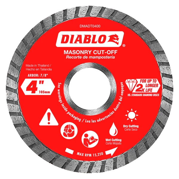 Diablo's diamond turbo masonry cut-off discs provide extreme durability and longer life in concrete, brick and cinder block applications. These continuous rimmed diamond discs deliver up to 2X longer cutting life versus standard diamond cut-off discs. The disc's industrial-grade diamonds coupled with a hardened disc body delivers lasting durability and maximizes cutting quality in hardened materials even in extreme applications.