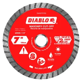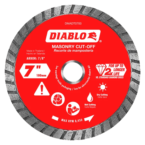 Diablo's diamond turbo masonry cut-off discs provide extreme durability and longer life in concrete, brick and cinder block applications. These continuous rimmed diamond discs deliver up to 2X longer cutting life versus standard diamond cut-off discs. The disc's industrial-grade diamonds coupled with a hardened disc body delivers lasting durability and maximizes cutting quality in hardened materials even in extreme applications.