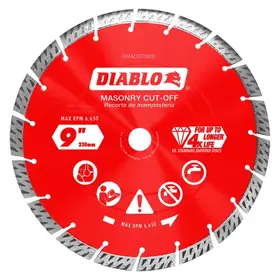 Diablo's diamond segmented turbo rim masonry cut-off blade provide extreme durability, faster cuts and longer life in concrete, concrete with rebar, brick and cinder block. These diamond rimmed discs deliver up to 30% faster cuts versus standard diamond cut-off discs. The disc's industrial-grade diamonds with hardened disc body delivers lasting durability and maximizes cutting quality in hardened materials even in extreme applications.