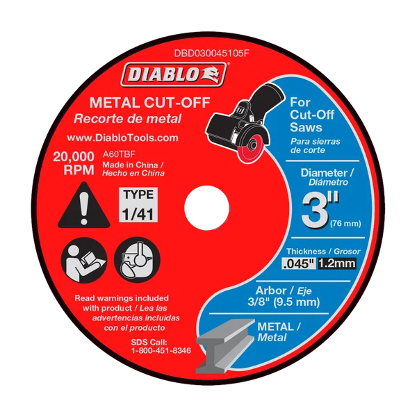 Diablo's premium metal cut-off discs provide superior performance and increased productivity. Featuring a premium aluminum oxide blend, these discs cut through material faster than other cut-off discs and offer an extra long cutting life. Diablo's thin kerf design provides for a thin, fast cut with minimal burr formation. Unlike other bonded discs on the market, this cut-off disc is a true .4 in. design. Fully reinforced for use in hand-held cut-off work. Ideal for use when working in hard to reach areas.