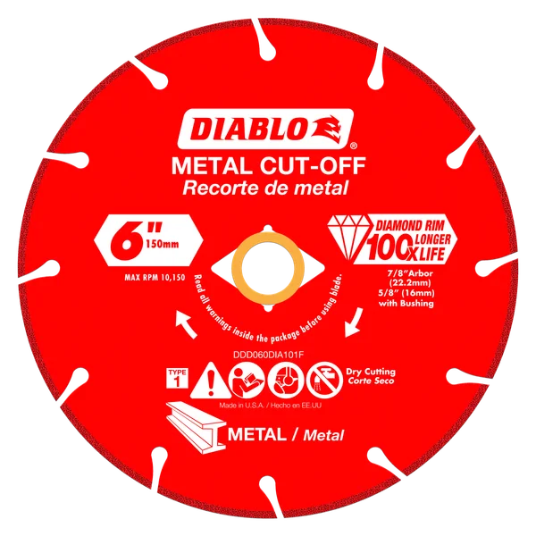 Diablo's Diamond Metal Cut-Off Discs deliver extreme durability, minimal downtime and increased productivity. These diamond rimmed discs deliver up to 100X longer cutting life versus a standard bonded cut-off disc in some of the most intense metal cutting situations. The disc's long-lasting durability maximizes cutting even in extreme applications such as rebar, angle iron, cast iron and steel bar. Diablo's diamond metal cut-off discs not only provide long lasting cutting life, durability and control, but they also allow for a safer cutting experience.