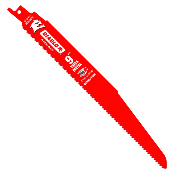 Diablo's Bi-Metal Reciprocating Saw Blades for Thick Metal are specifically designed for maximum performance in metal demolition applications. The blade's ultra-hardened cutting edge delivers up to 5X longer life compared to standard bi-metal blades. Dual Tooth design features a double tooth configuration with small gullets for faster material removal and extra durability. An oversized 1" blade body delivers straighter cuts with less vibration and chatter while Perma-SHIELD non-stick coating protects the blade from heat buildup, preventing gumming and corrosion.