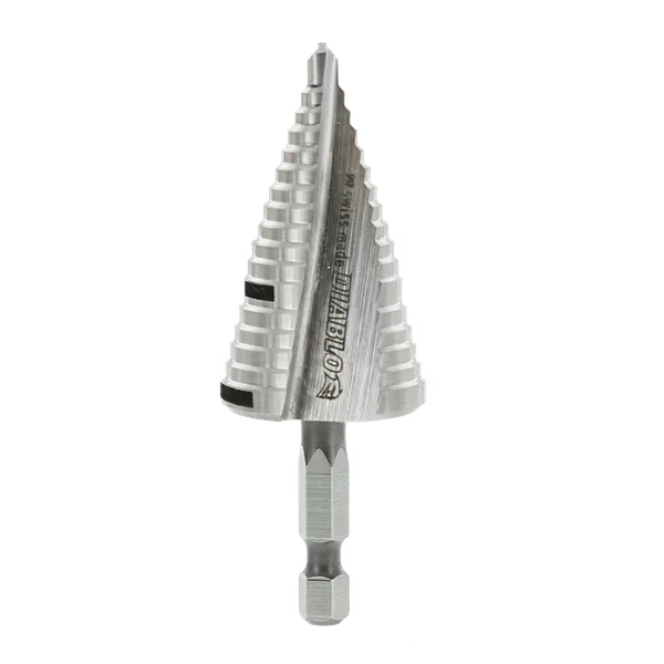 Diablo’s Impact Step Drill Bits bring exclusive technology to the Electrician, Plumber and HVAC contractor with fast, accurate cuts and increased stability in thin metals, PVC other plastic materials. The innovative Split Point Tip design enables a fast, on-point start resulting in increased durability and up to 6X longer life. An automated precision grinding process on each step reduces wear and delivers 2X faster cuts. Multiple hole sizes are made easy with laser etched step markings while increased step heights for common hole sizes makes drilling holes more efficient and faster. Designed with a ¼” hex shank, these bits are impact ready and can be used with drills and impact drivers.