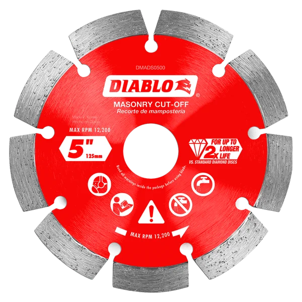 Les disques de découpe segmentés diamantés pour maçonnerie de Diablo offrent une durabilité extrême et une durée de vie prolongée dans le béton, le béton armé, la brique et le parpaing. Ces disques à bord diamanté offrent jusqu’à 2 fois plus de durée de vie que les disques diamantés standards. Les diamants de qualité industrielle, associés à un corps de disque durci, assurent une durabilité longue durée et maximisent la qualité de coupe dans les matériaux durs, même dans des applications extrêmes.
